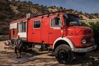 Auf einem Campingplatz im "Paradise Valley" in Marokko haben wir 2020 Bettina Müller kennengelernt, die mit ihrem alten Rundhauber neben uns stand. Das 40 Jahre Jahre alte Feuerwehrfahrzeug befindet sich im originalen Superzustand und wurde von ihr selbst zum Wohnmobil umgebaut.