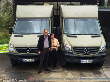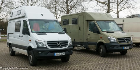 Vor Jahren haben wir auf einem Parkplatz am Rhein ein Fahrzeug (links im Bild) gesehen, in das wir uns sofort verliebt haben und dessen Besitzer uns damals einen Blick ins Innere werfen ließen. Unser Paul entstand 3 Jahre später basierend auf diesem Vorbild. Leider haben wir das Fahrzeug und seine Fahrer aus den Augen verloren und auch unserer Ausbauer konnte keinen Kontakt zu Hartmut und Margarete Walter herstellen, wahrscheinlich weil die beiden mal wieder in Südamerika unterwegs waren.