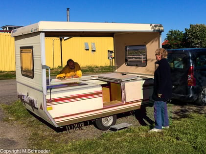 Mitten in Schweden stellt sich ein ungewöhnliches Gefährt neben uns und wird entfaltet: Ein Klappwohnwagen aus Belgien! Wir kommen schnell ins Gespräch und es entwickelt sich ein netter Abend.