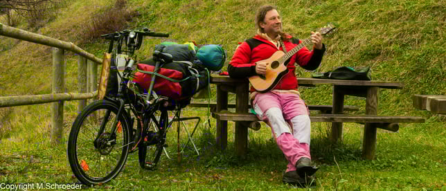 Manfred haben wir auf einem Stellplatz in den französischen Cevennen kennen gelernt, als er plötzlich in der Dunkelheit sein Zelt hinter unserem Womo aufbaute. Er war bei eisigen Temperaturen rund um den Gefrierpunkt mit Fahrrad, Gitarre und Zelt unterwegs. Wir kamen ins Gespräch und verbrachten einen gemütlichen Abend bei Rot- und Weißwein in unserem Womo. Es stellte sich heraus, dass er Braumeister einer eigenen, kleinen Brauerei mit Bräustüberl in Aichach, ganz in der Nähe von Augsburg ist: