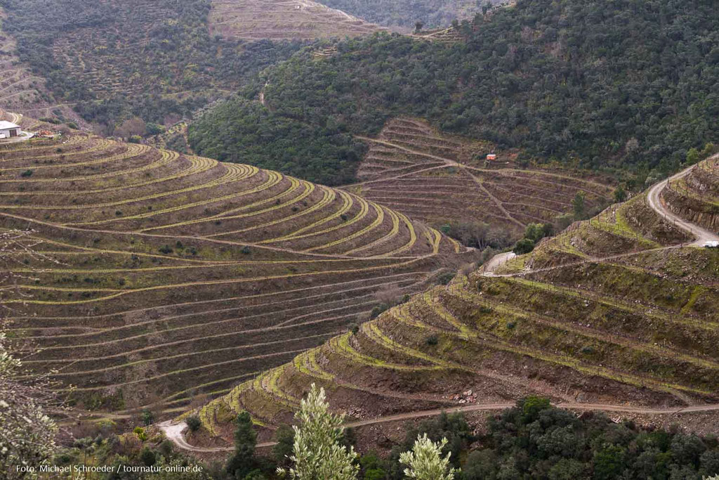 Wir wundern uns über die hier praktizierte Art des Weinanbaus, die wir in dieser Form bisher noch nirgends gesehen haben. Die meist steilen Hänge sind terrassiert und zum Teil sogar mit Stützmauern versehen. Jede Terrasse weist zwei Reihen Reben auf, die zwischen sich eine Art Weg einschließen. Eine maschinelle Bearbeitung scheint praktisch unmöglich, zu eng ist das hier für einen Traktor und erst recht für Einsatz eines Traubenvollernters.