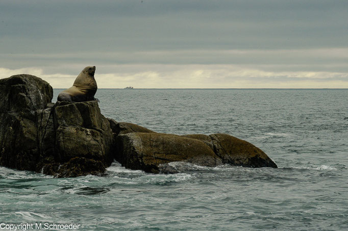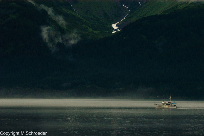 Wir bevorzugen eine Abfahrtzeit am frühen Morgen und hoffen durch die kleinere Gruppe auf das besondere Erlebnis Wir werden nicht enttäuscht. Unsere Kapitänin verspricht uns, dass wir die ins Meer kalbenden Gletscher bei Sonnenschein erleben werden. Ein Blick in den frühmorgendlichen Dunst lässt uns ihre Worte anzweifeln. Nach kurzer Fahrt wird es aber heller. Wir sehen Seeotter, Trottellummen und Seelöwen. Als wir auf Buckelwale und Orcas treffen, scheint das Glück perfekt. Auch wenn keiner an Bord schnell genug die Kamera zückt, als einer der Orcas keine 5 Meter vom Boot zum Sprung ansetzt. Im Kopf aber hat es „klick“ gemacht; das Bild bleibt, auch ohne Photo.