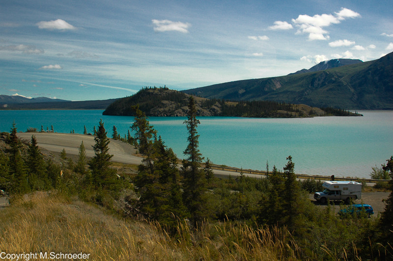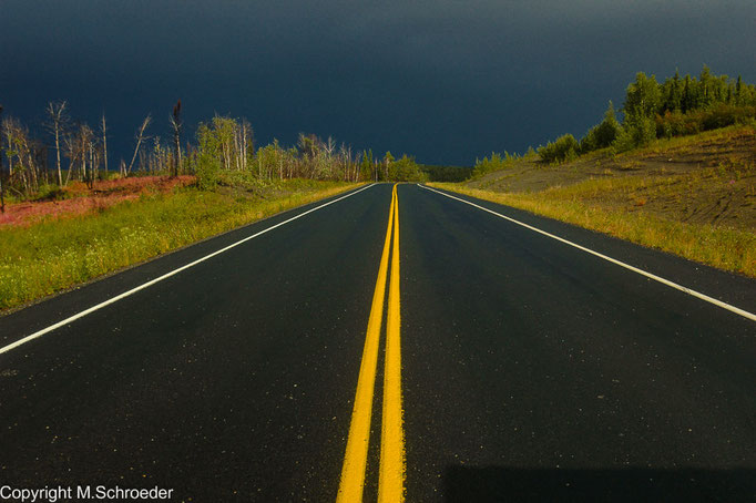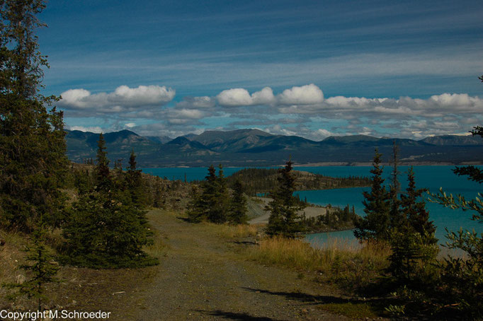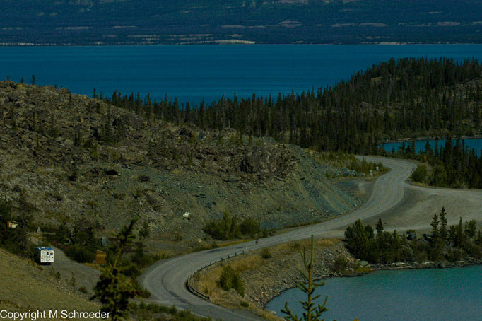 Langsam aber sicher neigt sich unsere Reise dem Ende zu und wir fahren über den Glen und Alaska Highway zurück nach Whitehorse. Der Alaska Highway wurde im zweiten Weltkrieg in Rekordtempo gebaut, um eine Versorgung der Truppen im Norden sicherzustellen. Heute stellt er die mehr oder weniger komfortable Verbindung zwischen Anchorage und Whitehorse dar, denn er besteht zu einem großen Teil aus Schlaglöchern.
