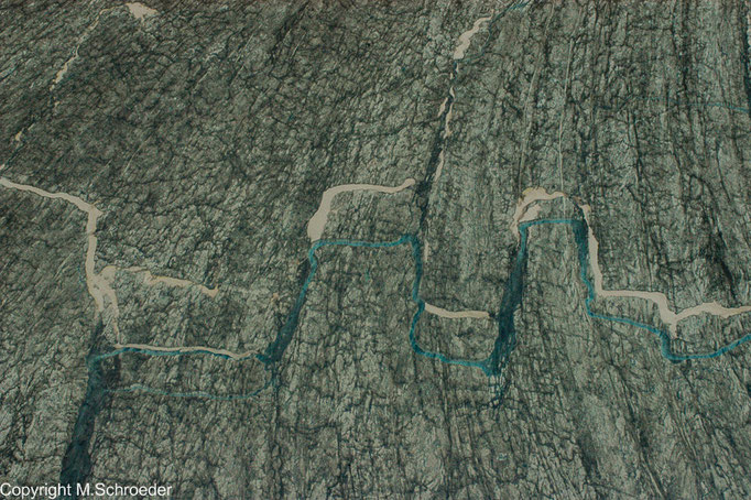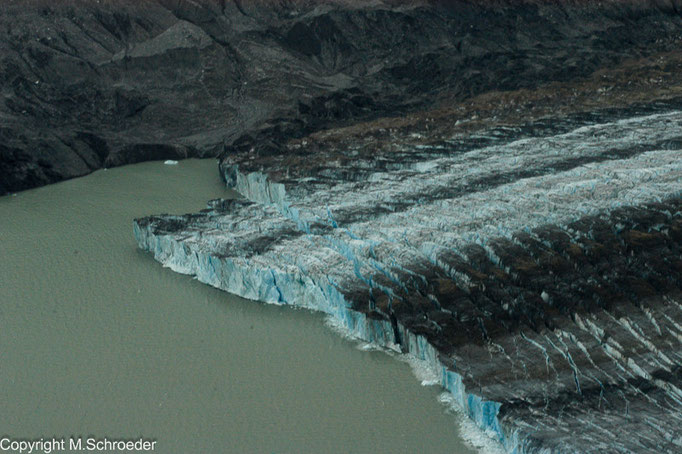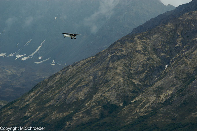 Der Pilot warnt uns, dass es holprig werden wird. Leider hat er Recht. Wir versuchen uns, unsere Kameras und in den heftigsten Momenten selbst die Sitze der Mitfliegenden festzuhalten. Nach kurzer Zeit sind solche Nebensächlichkeiten aber vergessen. Wie Autobahnen wirkende Gletscherzungen, unwirklich blaue Seen und Flüsse in Form eckiger Mäander auf der Gletscheroberfläche fesseln den Blick. Der Pilot geht tiefer und wir sehen kalbende Gletscher, aber auch Elche und Bären. Auch wenn einzelne Passagiere mit Unwohlsein zu kämpfen haben, ist der Flug viel zu schnell zu Ende. Trotzdem, er bildet den krönenden Abschluss unserer Reise.