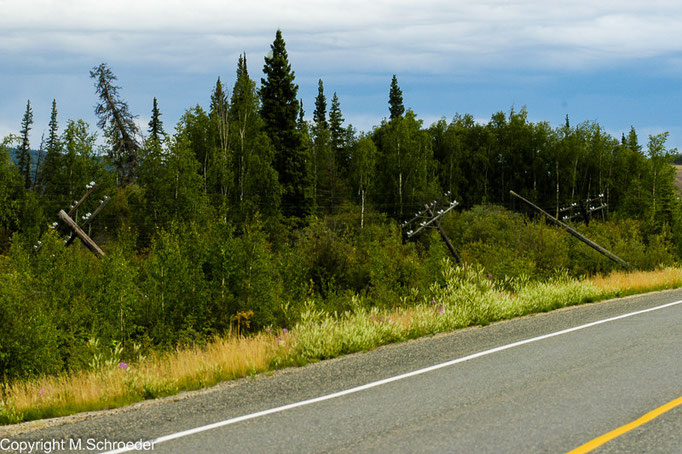 Diese rühren daher, dass der Highway, wie im übrigen alle Bauwerke hier, auf in der Tiefe dauerhaft gefrorenem Boden, so genanntem „Permafrost“, gebaut sind. Durch sonnen- oder heizungsbedingte Wärme taut die obere Schicht auf. Das Gebäude oder die Straße fängt an zu schwimmen. Häuser wie auch Telefonmasten versinken, in den Straßen bilden sich Löcher.
