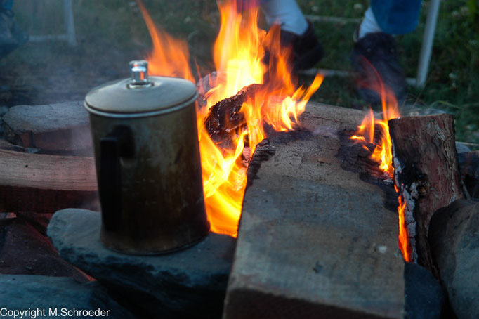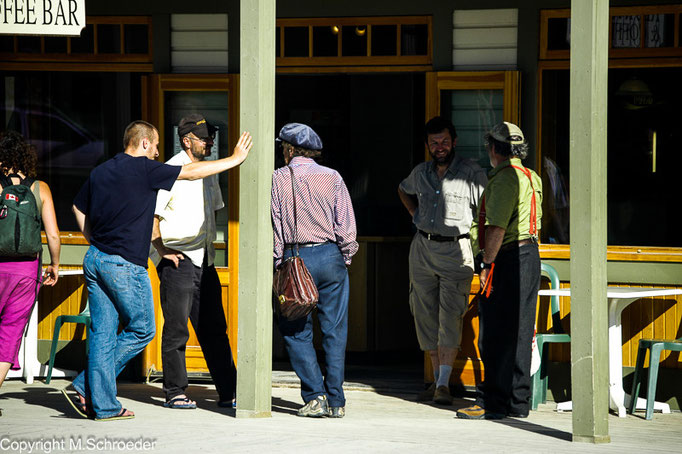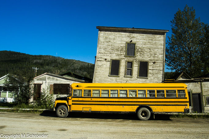 Dawson City (2000 Einwohner) versprüht auch heute nach den Charme des Gold Rush. Die Häuser sind liebevoll restauriert. Es ist offensichtlich, dass der Tourismus eine wichtige Einnahmequelle darstellt. Trotzdem - man spürt es an jeder Ecke - dieser Ort lebt. Wir schlendern durch die Straßen, halten Ausschau nach dem Saloon und werfen einen Blick in den General Store, in dem der moderne Trapper auch heute noch alles zum Leben Notwendige bekommt. Fast alles. Denn wir machen uns hier auf die Suche nach einem Eisenwarenladen. Wir brauchen dringend einen Kochtopf, denn man hat uns ohne Kochgeschirr auf die Reise geschickt. Als wir dies bemerkten, war es zum Umkehren bereits zu spät und die Autovermietung bittet uns am Telefon, doch unterwegs alles Notwendige zu kaufen.