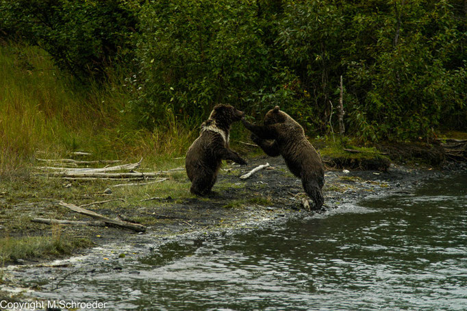 Da und die Strecke nicht wirklich überzeugt, drehen wir in Kenai Stadt um und fahren zurück nach Anchorage. Andere mögen anders denken, aber für uns war es die richtige Entscheidung. Etwas genervt treffen wir am Highway auf mehrere eilig abgestellte Fahrzeuge und halten an. Das Schauspiel, das sich uns bietet, ist kaum zu beschreiben, geschweige denn in Worte zu fassen. Im Fluss unterhalb des Highway bieten sich zwei junge Bären einen spielerischen Schaukampf. Für diese beiden ist das alles nur eine Vorbereitung auf die raue Wirklichkeit, für uns Zuschauer aber ist es Nervenkitzel pur.