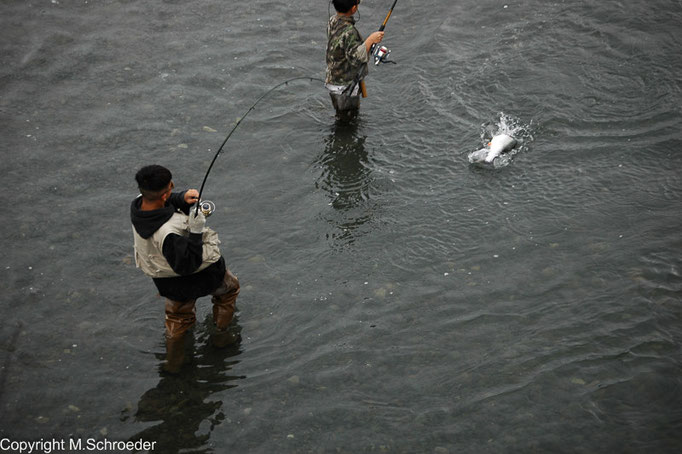 Anchorage (280.000 Einwohner) ruft uns zurück in die Wirklichkeit. Hier wohnt die Hälfte aller Einwohner Alaskas. Die Stadt ist zwar nicht die Hauptstadt, diese ist das nur per Schiff oder Flugzeug erreichbare und heißt Juneau, eine Metropole ist Anchorage trotzdem. Bei genauem Hinsehen, offenbart Anchorage seinen Reiz. Wenn man die Anglern, bei denen es sich oftmals um Werktätige handelt, die ihre Mittagspause nutzen, um das Abendessen zu fangen, beim Lachsfang beobachtet, weiß man wieder, dass hier die Uhren anders gehen.