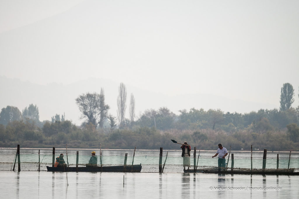 Die drei Lagunen vor Lezha bilden das Delta des Flusses Kleinen Drin. Neben den Hotelburgen im Norden gibt es südlich davon weitreichende Sumpfgebiete, die man zum Teil mit dem Auto befahren kann. Wir durchqueren die Hotelanlagen und biegen auf der Halbinsel Richtung Süden und erreichen die nördlichste Lagune: