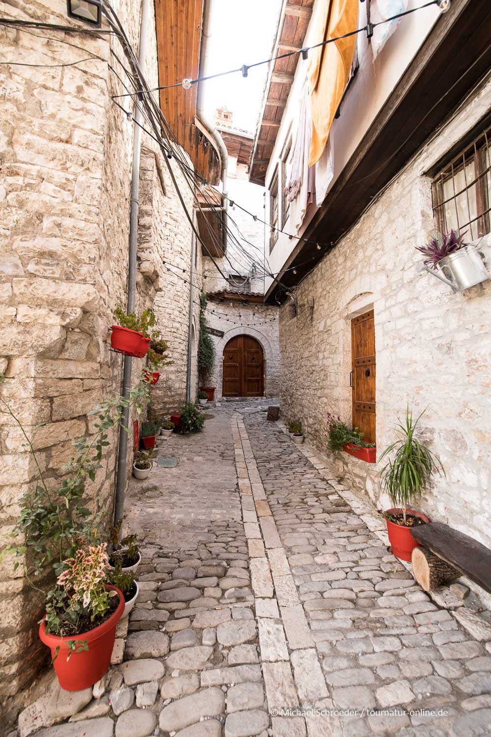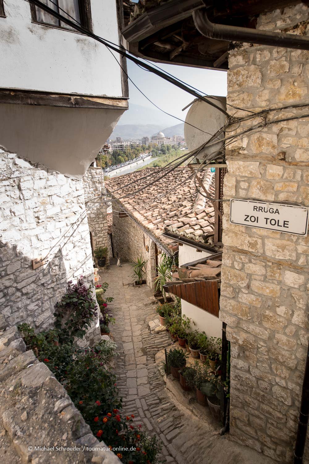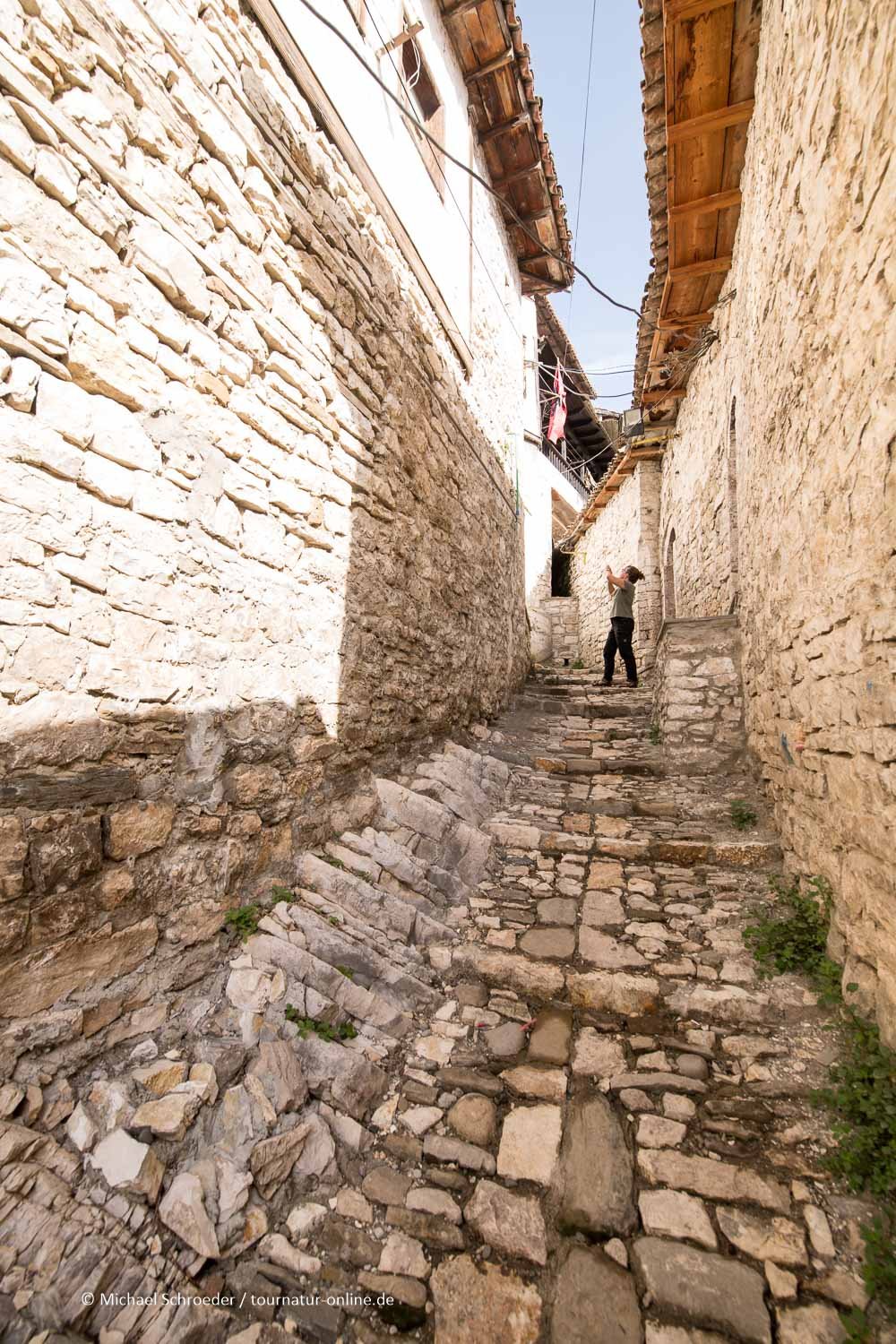 Unser erstes Ziel ist die Altstadt von Berat, die direkt am Parkplatz beginnt. Wir steigen einige Treppen hinauf und finden uns in einem Gewirr kleiner Gassen wieder: