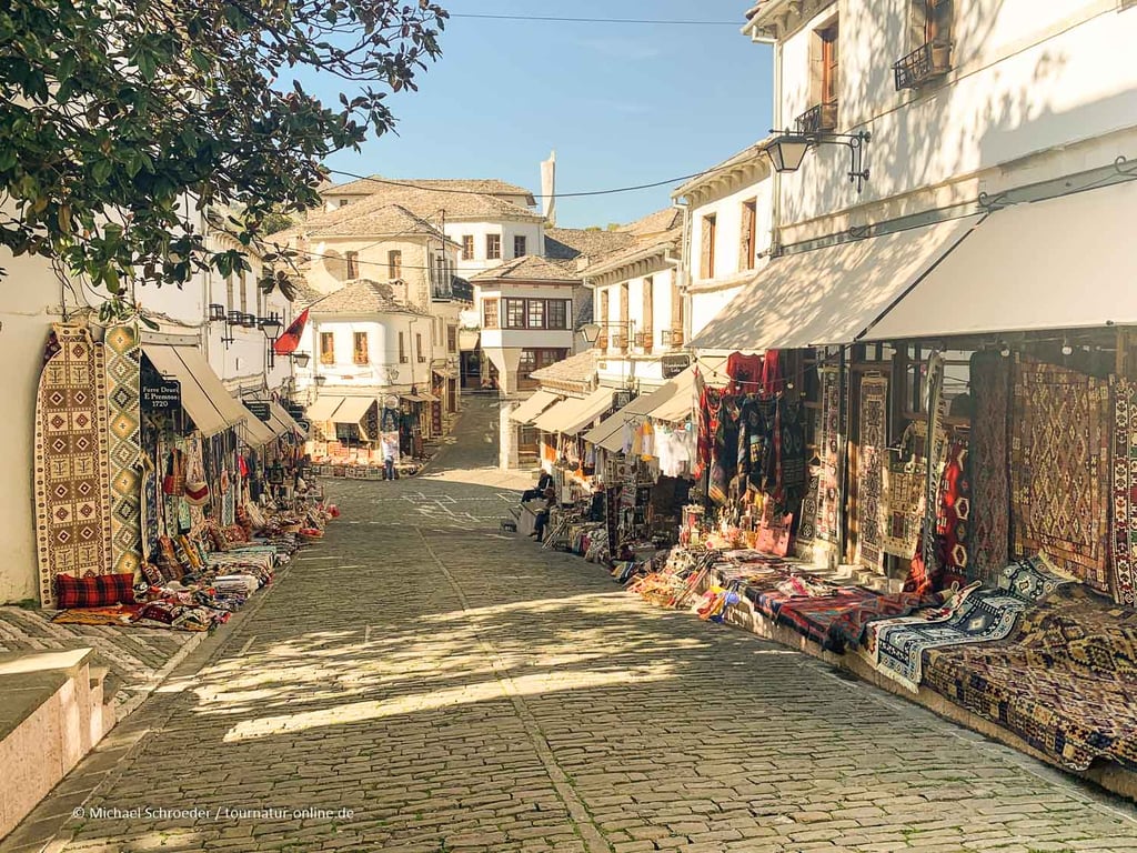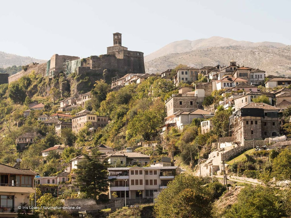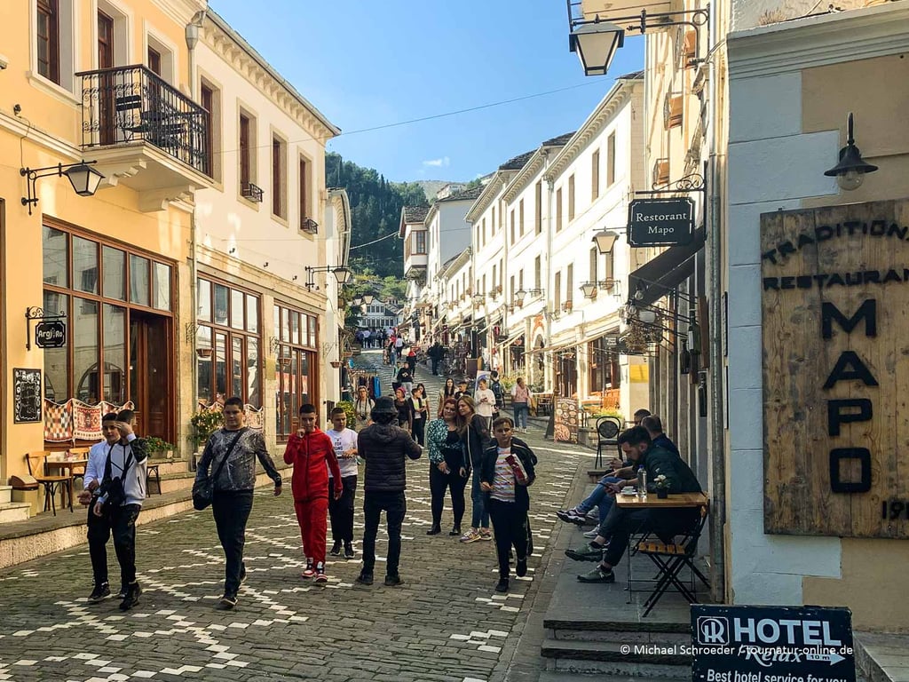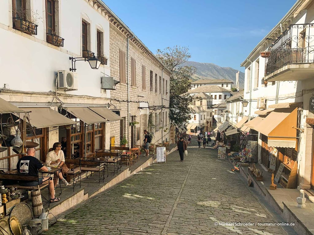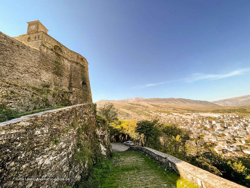Von hieraus starten wir einen Rundgang durch die osmanische Altstadt von Gjirokaster. Es ist schon sehr touristisch, aber jetzt im Oktober nicht überlaufen. Uns gefällt es.