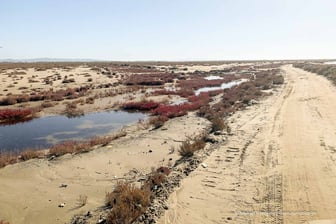 Der Weg führt uns in die Lagune. Links und rechts flaches Wasser, eigentlich ein idealer Ort für Vögel. Auf einer Infotafel lesen wir, dass es hier vor allem Pelikane und Schelladler geben soll; nur zu sehen bekommen wir davon praktisch nichts.