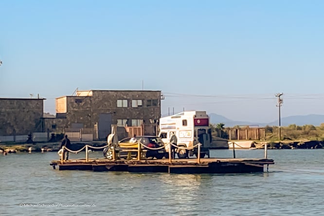 Mit einer kleinen Ponton-Fähre setzen wir über auf die Halbinsel von Kmasil. Wir sind doch sehr überrascht über den Preis: 1400 Lek (12 €) für 100 Meter Überfahrt. Ein erstes Zeichen, dass wir jetzt in eine sehr touristische Region kommen.