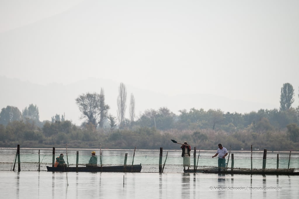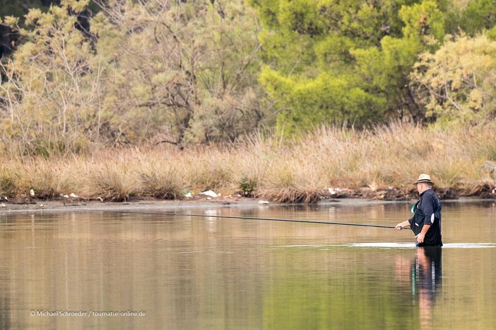 Auf dem Wasser fischen traditionelle Fischer mit ihren Netzen und immer wieder treffen wir auf Angler.