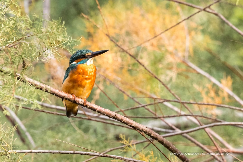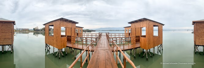 teilt sich die Straße. Wir fahren rechts in den unbefestigten Weg. Entlang des Wasser beobachten wir auf den nächsten 4 Kilometer Vögel wie Habicht, Rohrweihe, Silber- und Seidenreiher, eine Kolonie der seltenen Krauskopfpelikane, Flamingos und immer wieder Eisvögel. Im Laufe der kurzen Zeit sehen wir mindestens zehn unterschiedliche Eisvögel - wenn nicht mehr!