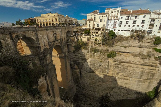 Eingebettet in eine Berglandschaft liegt auf etwa 720 Metern über dem Meeresspiegel liegt Ronda, das obschon Stadt zu den weißen Dörfern gezählt wird. Die maurisch geprägte Altstadt liegt auf einem Felsplateau und ist von der übrigen Stadt durch eine tiefe Schlucht getrennt wird. So sind es auch die Brücken, die Rondas beliebtestes Fotomotiv darstellen.