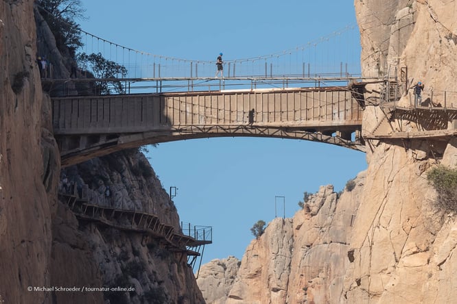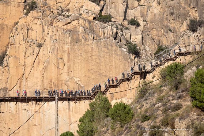 Der Camino del Rey in der Nähe von Álora in der Provinz Málaga wurde in den frühen 1900 Jahren angelegt, um Material zum Bau einer Wasserleitung zu transportieren. Die waghalsige Konstruktion verfiel über die Jahre und zeitweilig als einer der gefährlichsten Klettersteige der Welt. Im Jahr 2015 wurde er zu einem gesicherten Wanderweg umgebaut und ist nun ein Touristenmagnet, der bequem und sicher begangen werden kann. Auch heute führt er aber in schwindelerregender Höhe an steilen Felswänden entlang und über tiefe Schluchten. Der Einstieg erfolgt am Nordeingang, wo sich auch große Parkplätze befinden. Es gibt einen Pendelbusverkehr.