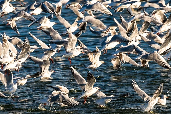 Wir sehen aber trotzdem große Möwenschwärme, Stelzenläufer, diverse Entenarten, darunter Löffelenten und aus der Ferne auch die rosa Flamingos, die hier brüten und für die das Gebiet bekannt ist. Auf den umliegenden Feldern stehen Kraniche.