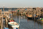 Errichtet in den 50er und 60er Jahren des letzten Jahrhundert erstrecken sich hier unweit des Ortes Carrasqueira Bootsstege auf Stelzen hinein in das schlammige Delta des Sado. Auch wenn der aus ungleichen Stangen und Brettern errichtete Steg mehr als wacklig wirkt, so ist er doch auch heute noch in Benutzung und bietet den Fischerbooten selbst bei niedrigem Wasserstand die Möglichkeit zum Anlegen. An den Stegen haben die Fischer aus Altholz kleine Hütten zur Aufbewahrung ihrer Ausrüstung und zur Verarbeitung der angelandeten Fische errichtet. Gerade dieses einfache und oft provisorische Ambiente macht die Anlage aus, die man erst auf den zweiten Blick als Sehenswürdigkeit wahr nimmt.
