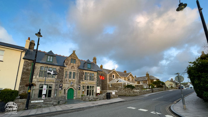 Um so überraschter sind wir, als wir in dem kleinen Ort Tintagel auf einen voll ausgestatteten Stellplatz mitten im Ortskern stoßen. Tintagel ist eigentlich bekannt für seine spektakulär gelegene Burgruine Tintagel Castle, die in engem Bezug zu den Legenden um König Artus steht. Oberhalb der Anlage erhebt sich ein riesiges im Stil eines Schlosses erbautes Hotel.