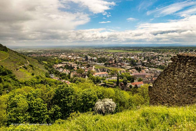 Von hier oben hat man einen schönen Blick auf Thann, die steilen Weinberge und das südliche Elsass.