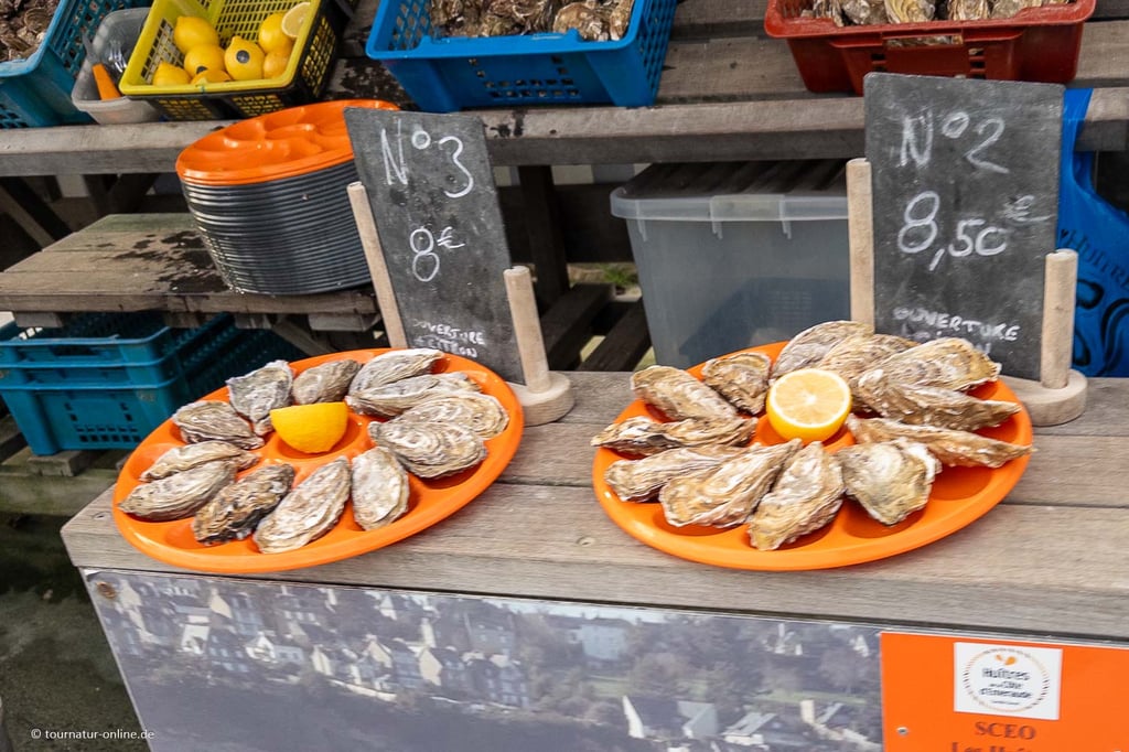 Besonders beliebt sind die Verkaufsstände des Marché aux huîtres (täglich geöffnet, Öffnungszeiten variieren abhängig von der Saison). Zahlreiche Besuchern genießen hier direkt am Stand frisch geöffnete Austern, dazu gibt man ein wenig Zitrone, bevor das Meeresgetier mit einem Glas Wein die Kehle hinuntergespült wird. Wir haben durchaus schon einmal Austern probiert, geschmeckt haben sie uns aber nicht wirklich. So bleibt es auch heute einmal wieder beim Schauen.