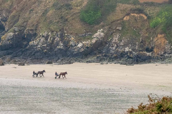 Leider sind die Bedingungen bei unserem Besuch suboptimal: Das Wetter ist grau in grau und es ist natürlich mal wieder Ebbe. Statt Vögeln bekommen wir dafür etwas, zumindest für uns, ganz Besonderes geboten: Am Strand sind Traber mit Pferd und Sulky unterwegs. Ein selbst für Pferdefreunde nicht alltägliches Motiv!