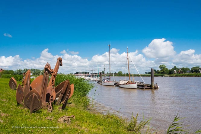 Zur Rast lädt das festliegende Restaurantschiff "Ostekieker" direkt bei der Kirche ein, neben dem eine Stör-Skulptur nicht nur an den ausgerotteten Fisch und die Anstrengungen zu seiner Wiederansiedlung erinnert, sondern auch anzeigt, ob gerade auf- oder ablaufendes Wasser herrscht.