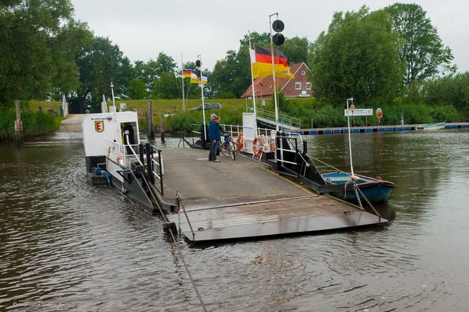 Nur wenige Kilometer weiter liegt das kleine Örtchen Gräpel, wo gleich eines der Highlights unserer Reise wartet. Am "Gasthof Plate" ist die letzte handbetriebene Prahmfähre Deutschlands in Dienst, die auch heute noch Passagiere gegen ein kleines Entgelt über die Oste transportiert. Betrieben wird die Fähre von den Wirtsleuten des angrenzenden Gasthofs.