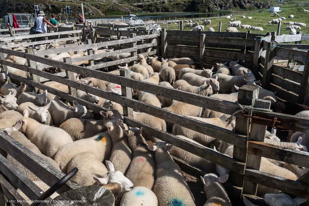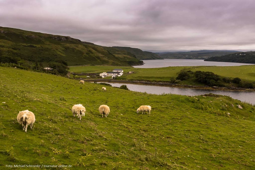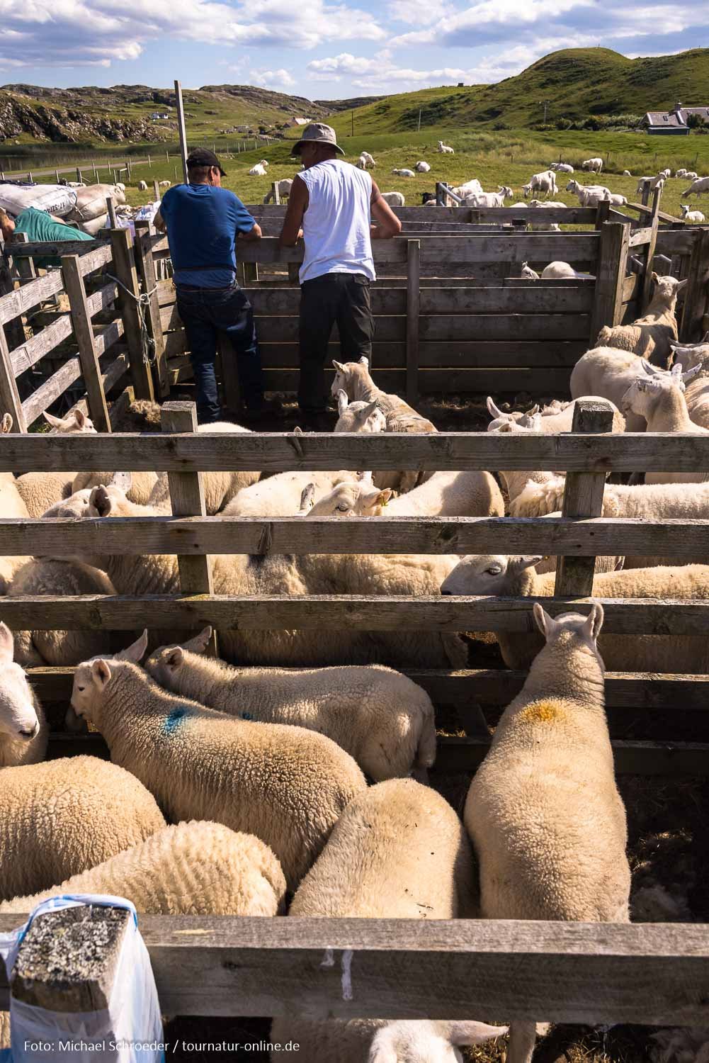 Nicht nur das Linksfahren will auf einer Reise durch Schottland gelernt sein. Auch die allgegenwärtigen Schafe sind eine Herausforderung. Schaf- und Rinderzucht machen einen Großteil der schottischen Landwirtschaft aus und da sowohl Schafe und Rinder frei grasen, sind sie allgegenwärtig. Vor allem für die Schafe ist klar: die Straße gehört uns. Viele lassen sich noch nicht einmal von einem dicht vorbeifahrenden Auto beim Grasen aus der Ruhe bringen, geschweige, dass sie die Fahrbahn freiwillig freigeben würden.