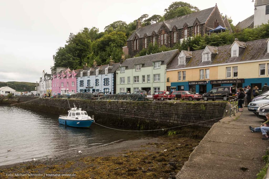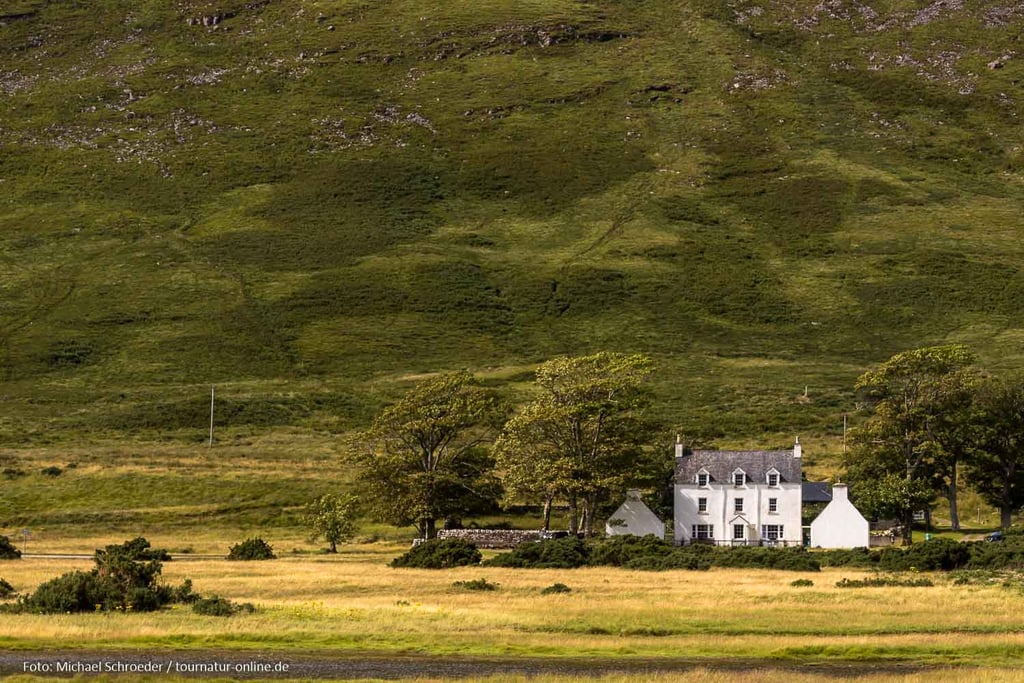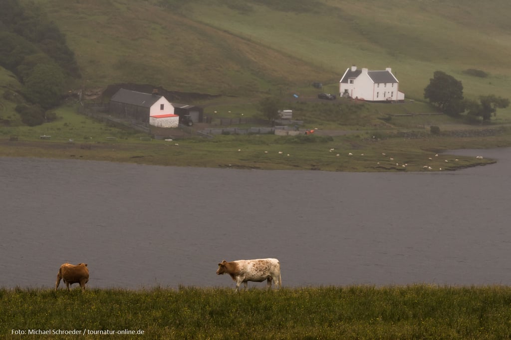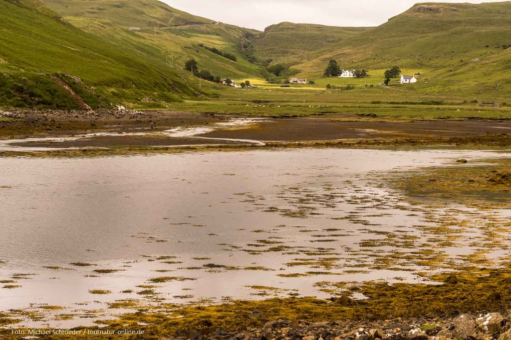 Am Fähranleger von Uig erkundigen wir uns nach einer Fährverbindung nach Harris, einer der äußeren Hebriden, Ein Übersetzen wäre erst in zwei Tagen möglich, eine Rückfahrt erst am Ende des Monats so gut gebucht sind die Fähren in der Hauptsaison. Ein Vorbuchen wäre ratsam gewesen. Wir setzen unsere Fahrt fort und verbringen den Abend in Portree, dem Hauptort der Insel. Bevor wir Skye am nächsten Morgen verlassen, machen wir noch einen kurzen Abstecher zum alten Fähranleger bei Kylerhea, da es hier zwei Beobachtungshütten für Otter gibt (ausgeschildert). Leider müssen wir feststellen, dass diese nur unter der Woche zugänglich sind und so macht und dies zusammen mit dem Wetter, dass die Landschaft in Nieselregen hüllt einen Strich durch die Rechnung.