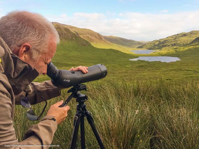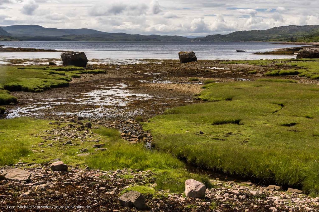 Uns begeistert die Passstraße "Bealach na Bà", die hinter jeder Kurve einen neuen Blick freigibt, ganz unvermutet auch immer wieder auf Rotwild, das gar nicht scheu, Bilder aus großer Nähe erlaubt. Auch die anschließende Küstenstraße ist sehr eindrucksvoll, hat man doch einen Ausblick den über den Sound of Raasay auf die Inseln Raasay und Skye. Leider können wir trotz intensivem Absuchen des Wasser weder Wale noch Delphine sehen, die sich hier immer wieder zeigen sollen. Auch Vögel bekommen wir erneut praktisch keine zu sehen.
