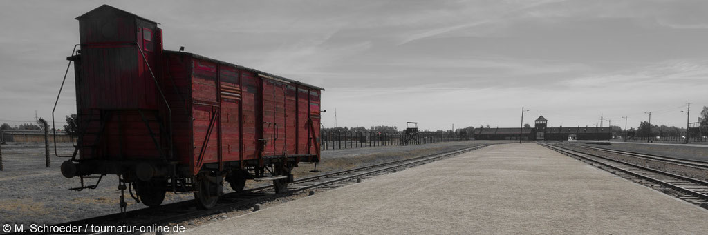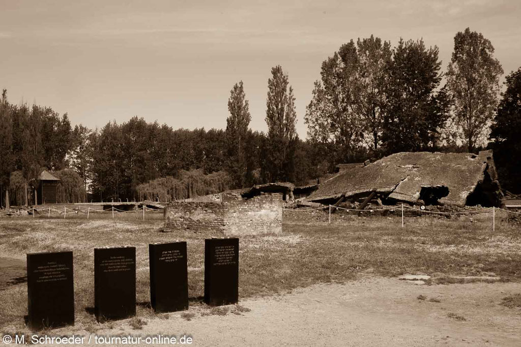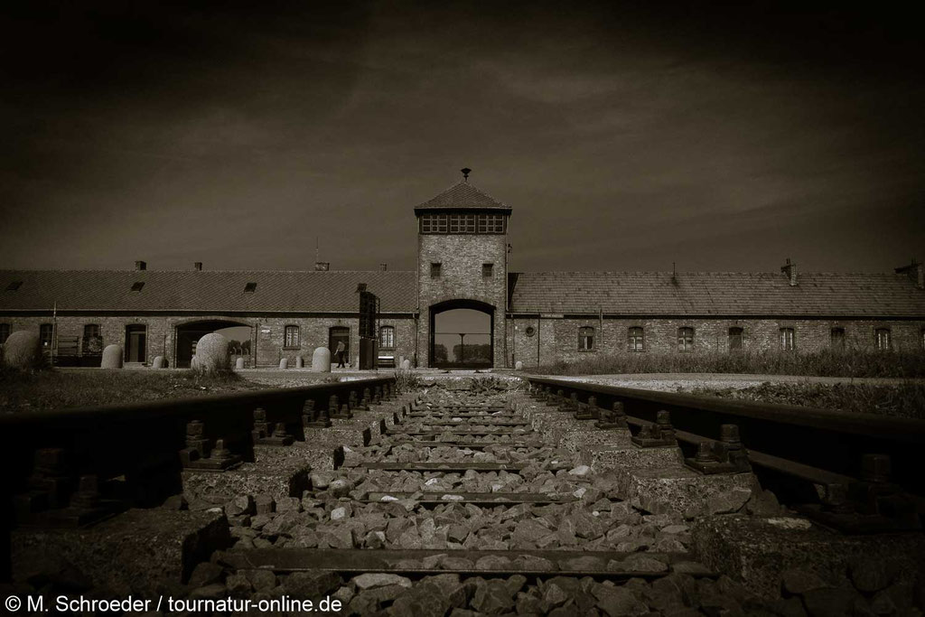 Das direkt in der Stadt Auschwitz bzw. heute polnisch Oświęcim liegende „Stammlager“ beherbergt heute eine Gedenkstätte mit Museum. Wir besuchen früh morgens das tagsüber frei zugängliche Gelände des „Vernichtungslager Birkenau“. Der Rundgang vorbei an Lagerbaracken, Überresten gesprengter Gaskammern und Mahnmalen, die daran erinnern, dass direkt neben den Gaskammern die Asche der Opfer in Massengräber geschüttet wurde, ist mehr als bedrückend. Wir verlassen das Lager als die ersten Bus-Touristen aus den USA und Asien heranströmen.