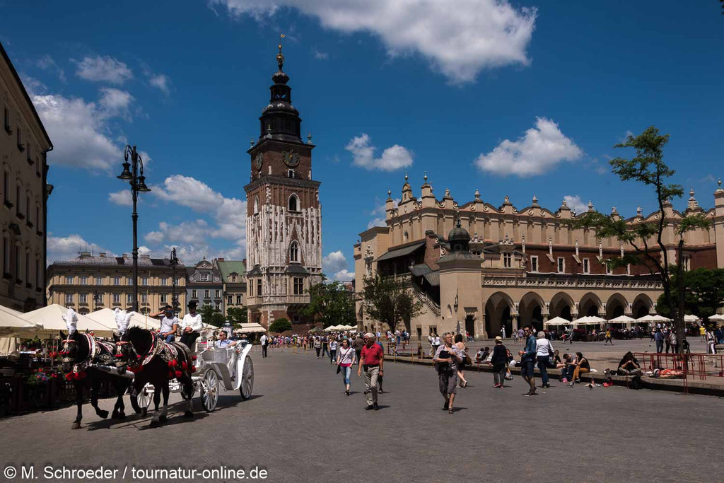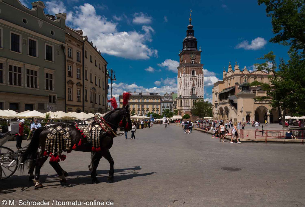 Krakau ist als Studentenstadt schon an sich eine "junge Stadt". Wie schon in Zakopane fällt uns hier zusätzlcih die große Zahl von Jugendgruppen auf und uns wird zugetragen, dass jetzt kurz vor den Sommerferien, die im Juli beginnen und zwei Monate dauern, traditionell die Zeit der Schulausflüge sei. Und so haben wir den Eindruck, dass die Mehrheit von Polens Bevölkerung deutlich unter 18 Jahre alt ist und die Meisten davon derzeit mit dem Bus in Polen unterwegs sind.