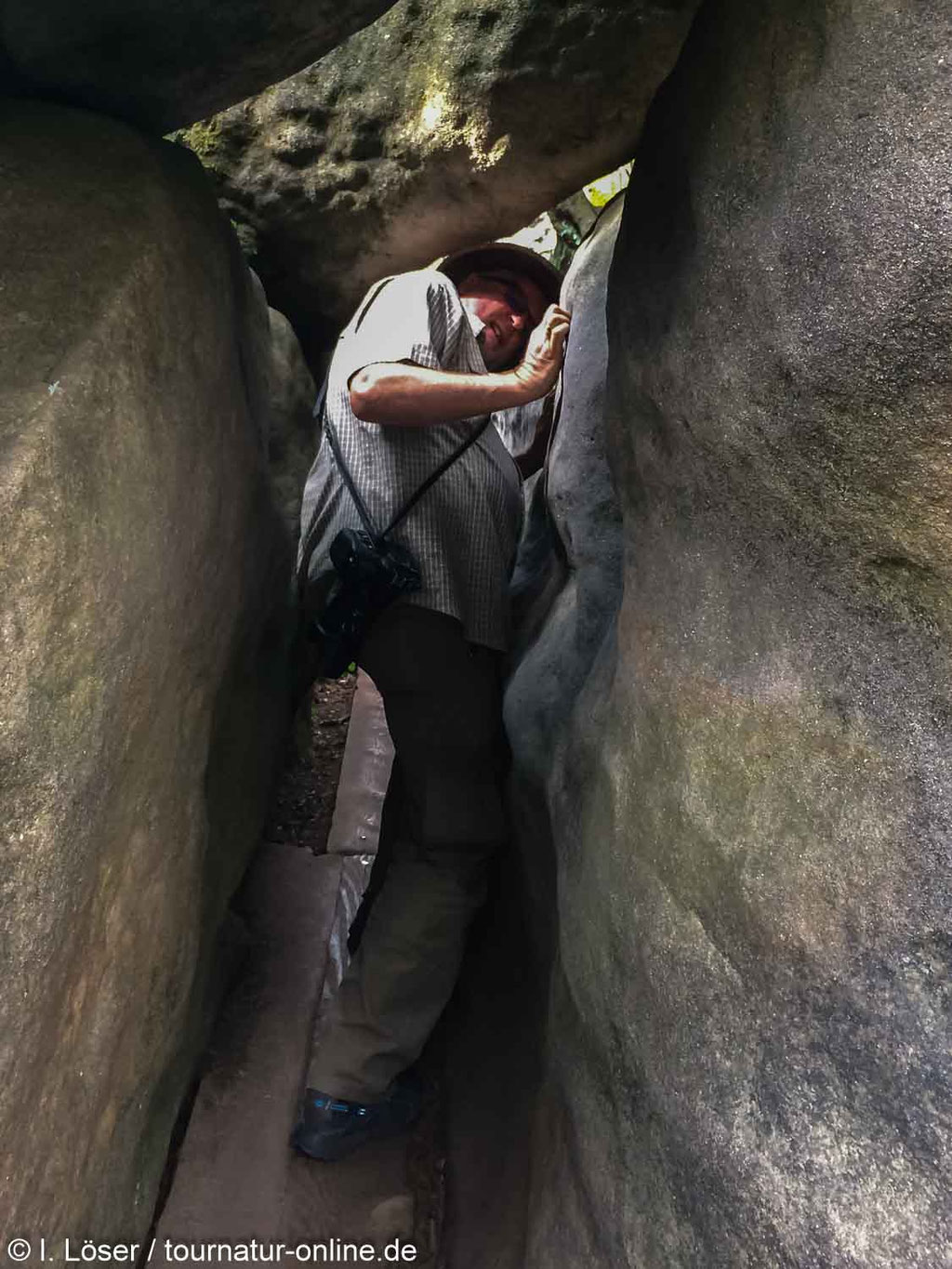 Bizarre Sandsteinstrukturen laden dazu ein, erkundet zu werden, und so zwängen wir uns das Felslabyrinth „Białe Skały“. Hier geht es wirklich „eng zu“ wie unsere Bilder zeigen. Eigentlich sollte am Kassenhäuschen jeder Besucher darauf hingewiesen werden, dass ein Durchkommen ab einer Körpergröße von über 1,85m und einem Gewicht von mehr als 100 kg schwierig werde könnte. Glücklicherweise müssen wir nicht umdrehen, wir sind aber auch gelenkig.