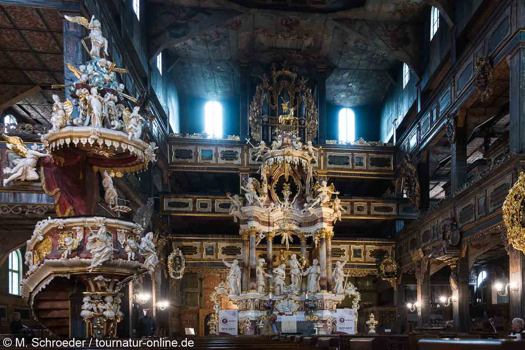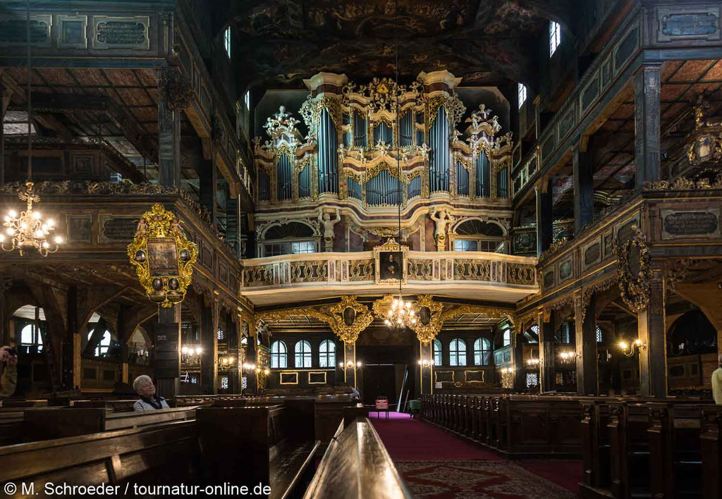 So macht die Friedenskirche in Schweidnitz von außen den Eindruck einer schlichten, wenn auch großen Fachwerkscheune und wir denken für einen Moment darüber nach, ob sich ein Besuch überhaupt lohnt.
