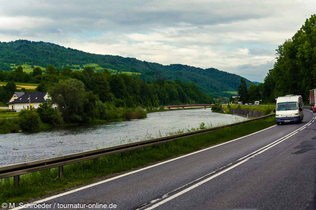 Wir machen einen Ausflug zum Schronisko PTTK Trzy Korony (N 49°24'18.4", O 20°24'40.3"), von dem aus Wanderwege in den Park starten und und genießen bei einem richtig guten Cappuccino den Blick auf den Fluss und das Gebirge, vor dem ein junger Seeadler seine Runden dreht.