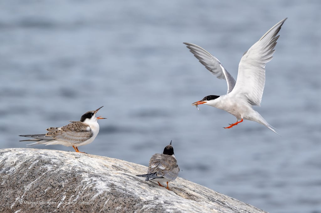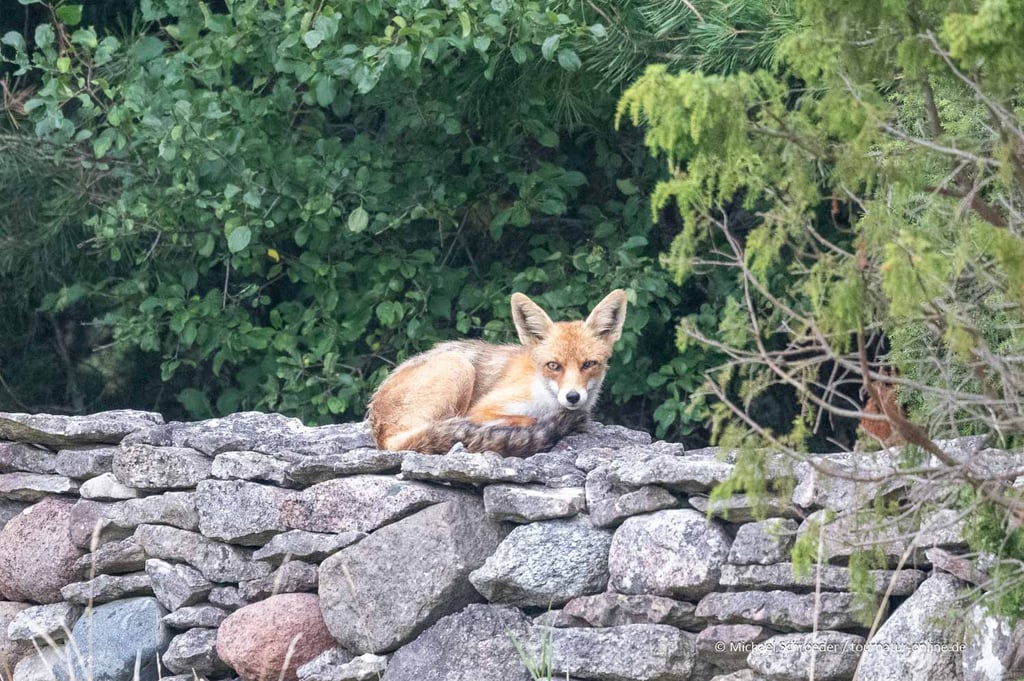 Am Morgen bekommen wir noch Graureiher, die sich nicht mögen, hungrige Flussseeschwalben und später noch einen auf einer Mauer liegenden Fuchs vor die Linse: