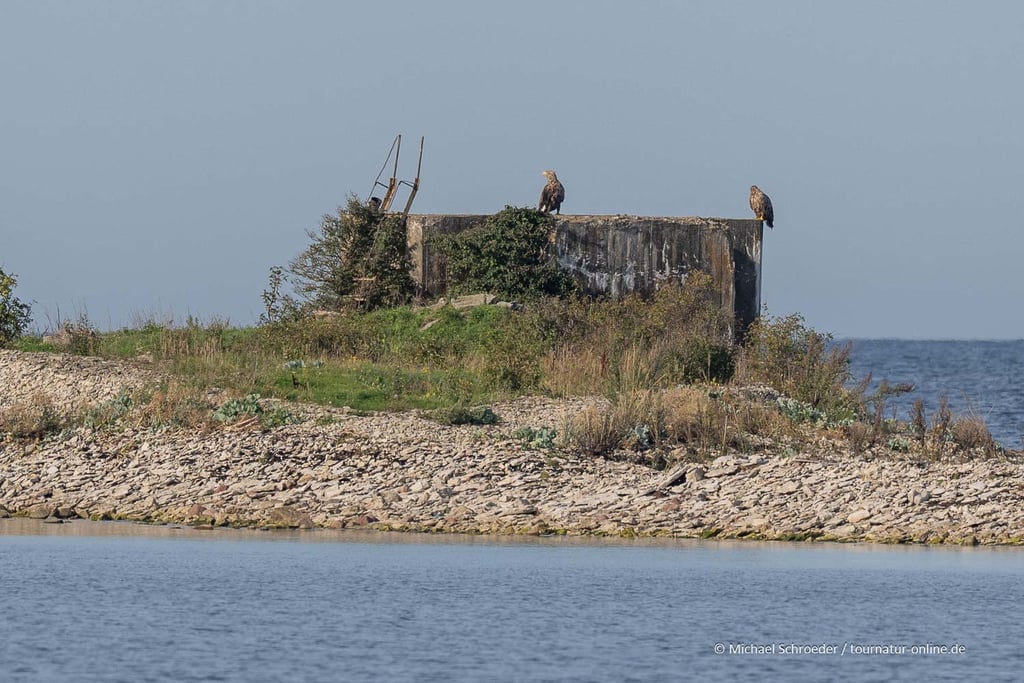 Auch hier gibt es wieder ein WC-Häuschen und Bänke und einen kleinen Hafen, an dem Fischer am Morgen mit ihren Booten zum Angeln hinausfahren. Wieder ist alles total entspannt. Unserem Platz liegt direkt am Meer. Vor uns eine Ruine, auf der sich zwei Seeadler niedergelassen haben.