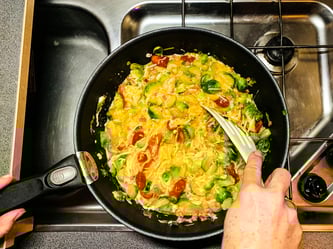 Klassisch wird die Fittata in einer feuerfesten Pfanne (-> mehr Infos zu unseren Pfannen; hier) im Ofen gebacken. Im Wohnmobil funktioniert das Rezept aber auch ganz wunderbar in der Pfanne auf dem Gasherd oder im Omnia-Backofen.