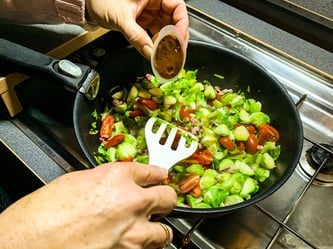 Sobald die Rosenkohlköpfchen beginnen auseinander zu fallen, die Tomaten und den Brühwürfel hinzufügen. Sollte die Tomaten nicht genugt Saft ziehen, etwas Wasser hinzugeben, damit sich die Brühe auflöst. Bei der Verwendung von Hack darauf achten, dass das Fleisch komplett gar ist, bevor es weiter geht.