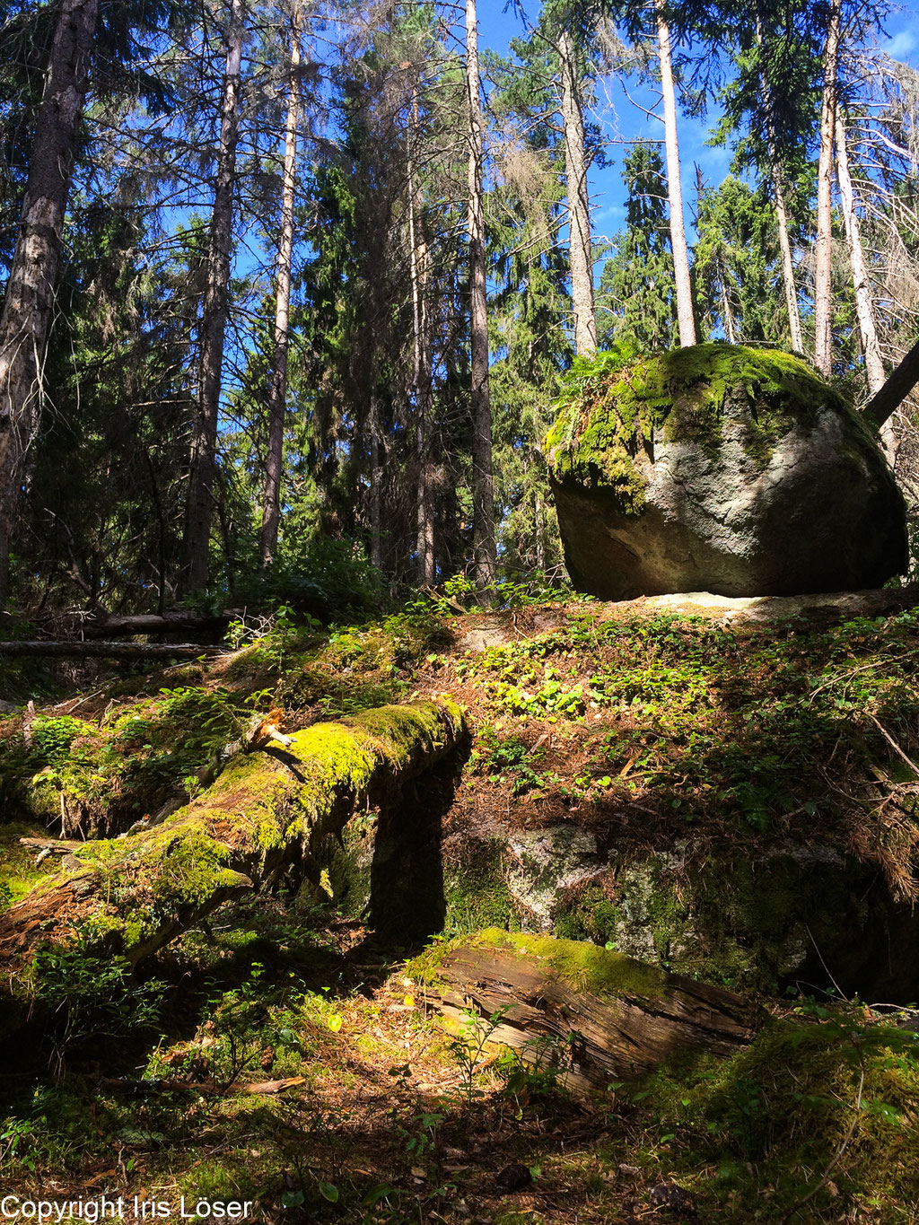 Am nächsten Morgen fahren wir wieder in den Park und machen eine nur ca. 2 km lange, aber anstrengende Wanderung, die erst an einem See entlang, dann aber durch wirklichen Urwald, über umgestürzte Bäume steil zu einem Felsenmeer hinauf und im wahrsten Sinne durch dieses wieder hinunterführt.