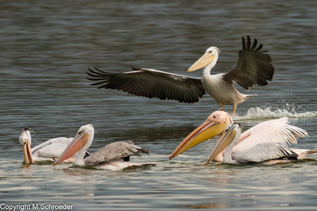 Wir werfen noch einen Blick auf die Wasservogelwelt und sind sehr überrascht, neben Flamingos eine Gruppe Pelikane zu entdecken. Es handelt sich um seltene Krauskopfpelikane, die man eher im Südosten Europas (Donaudelta) erwarten würde.