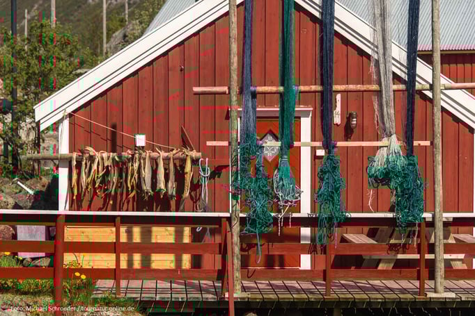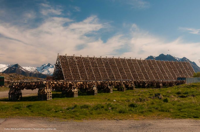 Entlang unseres Weges auf den Lofoten stoßen wir immer wieder auf Gestelle zum Trocknen von Fisch - fein säuberlich getrennt nach Körpern und Köpfen. Die Körper sind für den südeuropäischen Markt bestimmt, wo Trockenfisch eine Delikatesse darstellt. Die Köpfe werden nach Afrika exportiert, wo sie als Suppenbasis dienen. Wenn man die Gestelle übersehen sollte - kein Problem - man muss nur der Nase folgen, dann findet man sie unweigerlich.