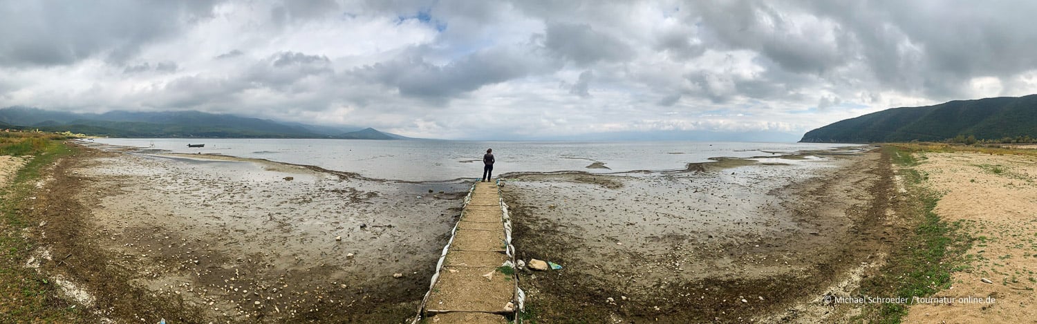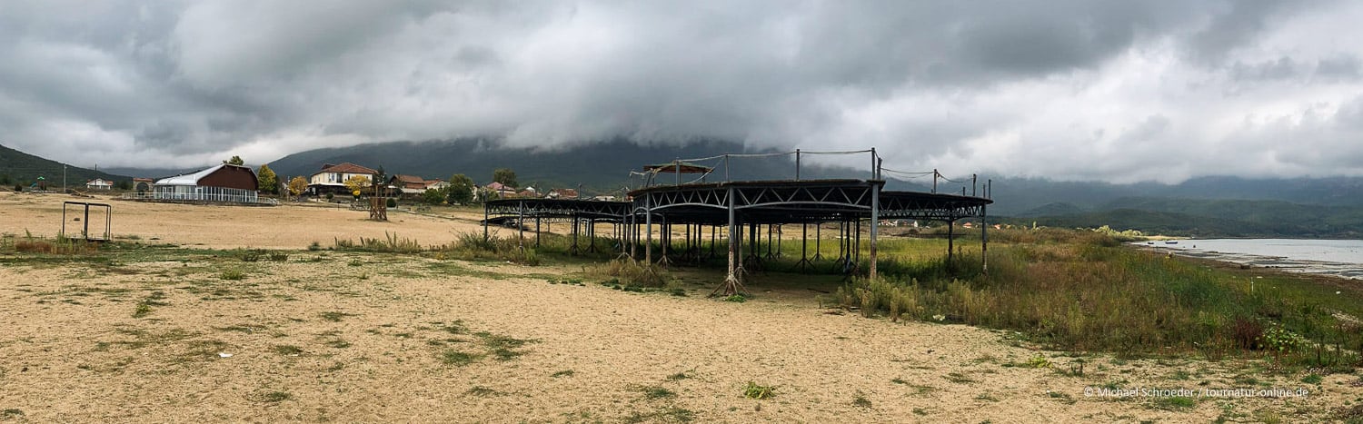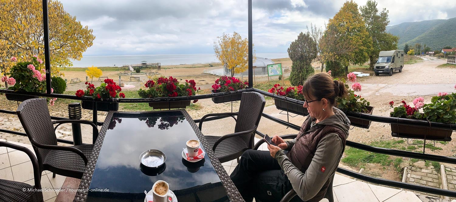 Unten im Tal angekommen erreichen wir den Großen Prespasee. In Stenje wollen wir eigentlich noch etwas entlang des Sees. Leider endete die Straße für PKW an einem doch in die Jahre gekommenden Restaurant mit "Strandpromenade". Sind an der Küste des Ohrid-Sees die Hotels auf dem neuestem Stand, ist hier am Prespasee noch der alte "Ost-Charme" zu spüren. Wir entschließen uns, hier einen Kaffee zu trinken: