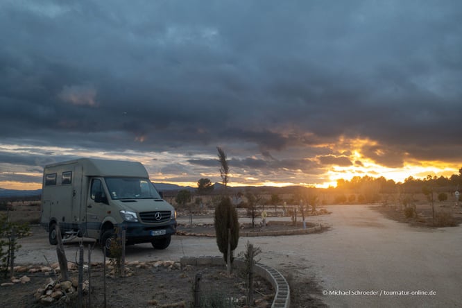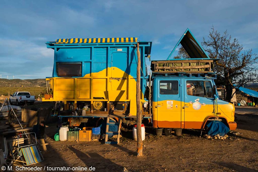 Bei unserer Ankunft werden wir von Franze, einem fahrenden Zimmermann aus Deutschland, der aufgrund eines Unfalls des ersten Eigentümers den Platz betreibt, begrüßt. Man merkt sofort, das hier ist weder Stellplatz noch Campingplatz, sondern ein Platz für Leute, die anders reisen als die Überwinterer, die man auf den Stellplätzen am Meer trifft.