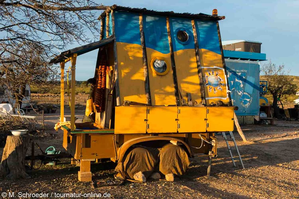Mittlerweile hat Zimmermeister Franze den Stellplatz mitten im Nichts fest übernommen und seinen Lebenstraum, die Reise nach und durch Afrika erst einmal auf Eis gelegt. Kürzlich hat er sogar Gelände hinzugekauft und weitere Parzellen eingerichtet.