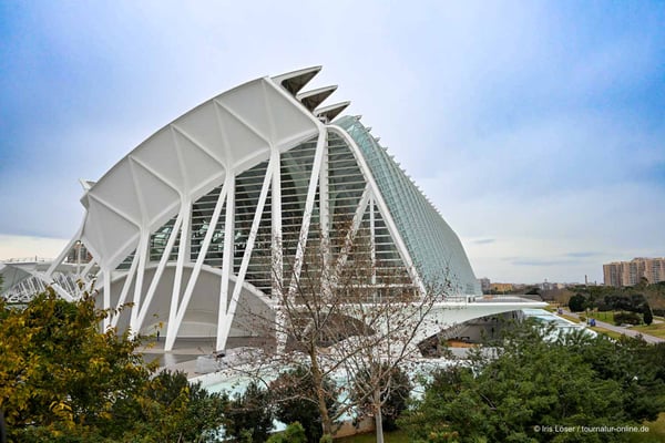 Valencia ist die Hauptstadt der Provinz Valencia, hat etwa 800.000 Einwohner und ist die drittgrößte Stadt Spaniens. Damit gehört sie eigentlich nicht zu unseren bevorzugten Zielen, denn wir vermeiden doch gerne Großstädte. Mehr zufällig führt uns unser Navi auf dem Weg gen Süden aber mitten durch die City und weckt so unsere Begeisterung für die Architektur der "Ciutat de les Arts i les Ciències" .