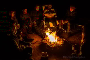 Abends sitzt man zusammen am Lagerfeuer, Zimmermann Franze hat für alle gekocht. Es schmeckt super, auch wenn die Temperaturen nahe dem Gefrierpunkt sind.