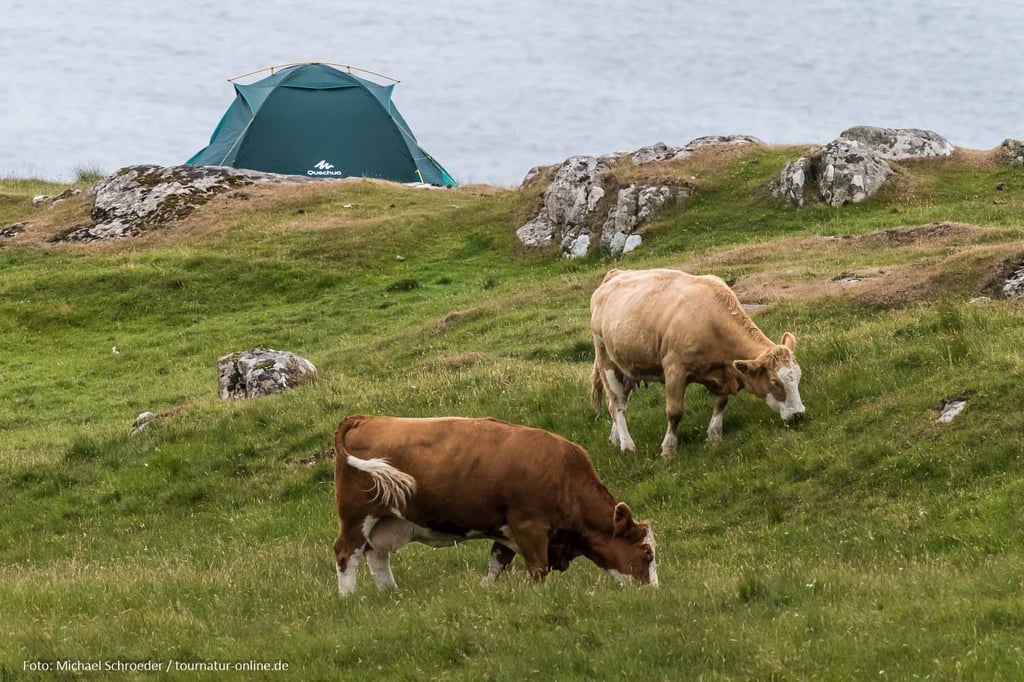 Wir landen im Inselsüden an, der nett ist, uns aber nicht wirklich beeindruckt, und stellen fest, dass hier deutlich mehr los ist, als bisher. Trotzdem finden wir einen netten Übernachtungsplatz an einer Wiese am Wasser, den wir uns aber mit einigen anderen Wohnmobilen und Zelten teilen. Wir beobachten, wie zwei Einheimische ein Schild montieren, das darauf hinweist, dass man doch bitte keine Feuerstellen hinterlassen solle, da dies schlecht für das weidende Vieh sei. Man hat hier in der Hauptsaison also doch so seine Schwierigkeiten mit den vielen Campern. Verboten das Übernachten hier allerdings nicht und wir werden von den beiden trotzdem freundlich gegrüßt.